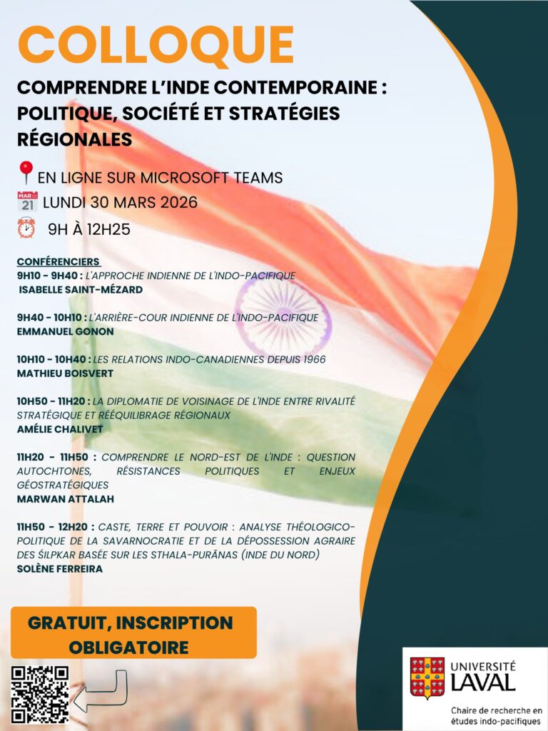 Le CERIAS est heureux d’annoncer la participation de plusieurs de ses chercheurs au séminaire intitulé « Comprendre l’Inde contemporaine: politique, société et stratégies régionales », organisé par la Chaire de recherches en études indo-pacifiques (CREIP) de l’Université Laval. Cet évènement aura lieu le lundi 30 mars 2026, de 9h à 12h15, en ligne. Les inscriptions sont gratuites mais obligatoires, sur le site de l’évènement (lien ici).